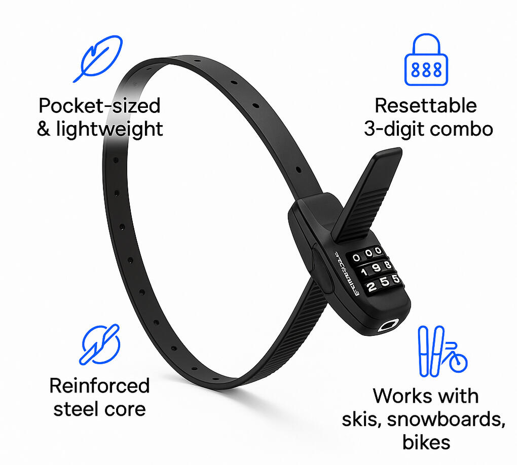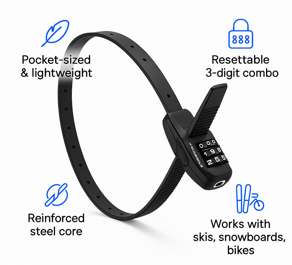 • Pocket-sized — weighs just 150g, fits in any jacket.• Glove-friendly — lock and unlock without taking gloves off.• Weather-resistant — built for snow and cold conditions.• Peace of mind — relax, your skis will be right where you left them.